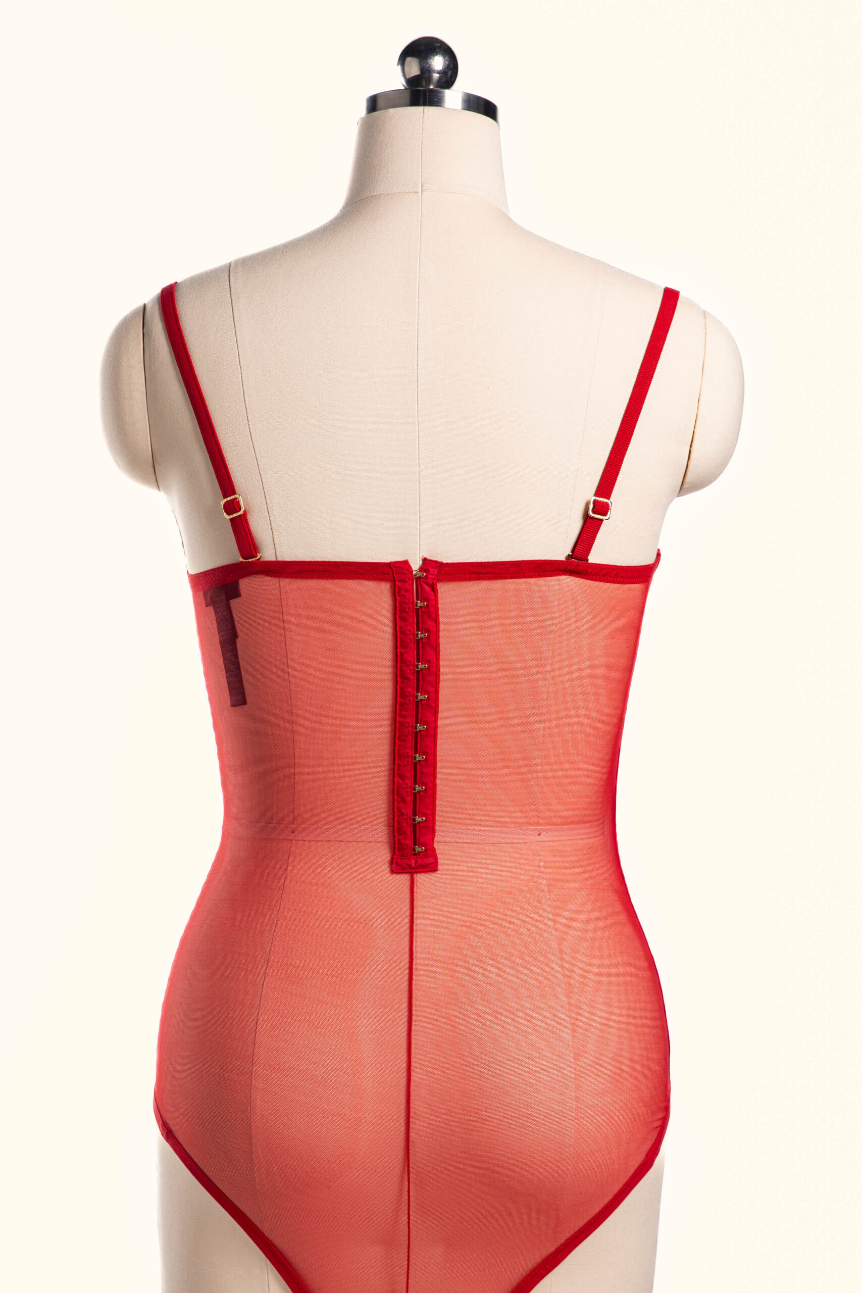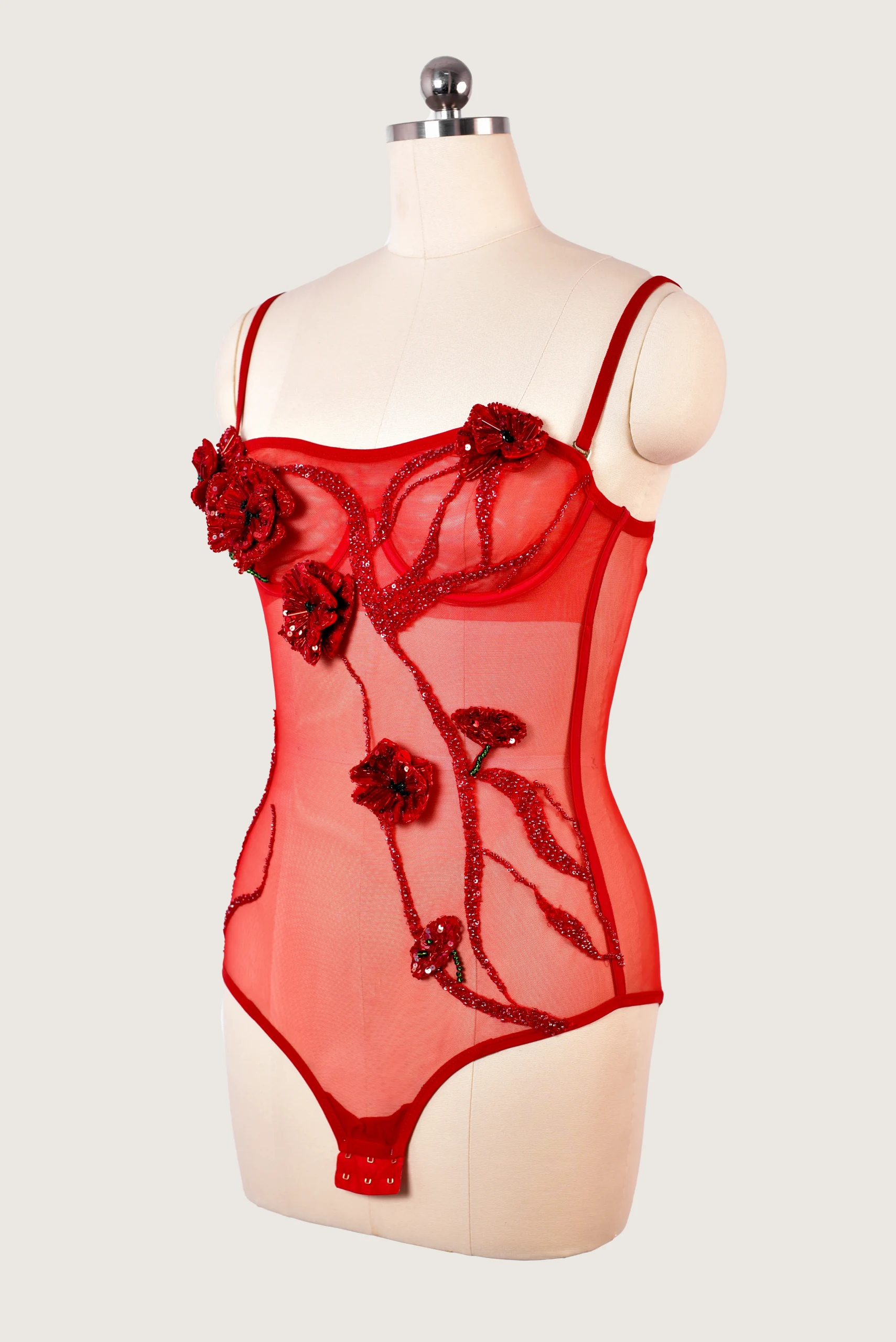 On a base of fiery red tulle, rescued from the forgotten archives of a prestigious fashion house, bloom sumptuous 3D roses, hand-embroidered with a precious blend of sequins, pearlescent beads, and Swarovski crystals.